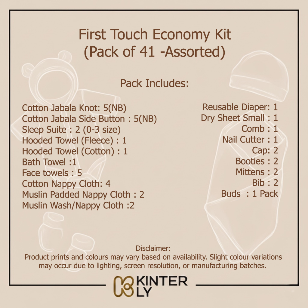 This thoughtfully curated newborn kit includes 34 high-quality essentials designed to provide comfort, hygiene, and everyday convenience for your little one. Made from soft, breathable muslin, premium cotton, and bamboo-cotton blends, the clothing and linen items are gentle on a newborn’s delicate skin. The kit features a complete range of jablas, bodysuits, sleepwear, towels, nappies, feeding and bathing essentials—ideal for hospital use and daily care at home.