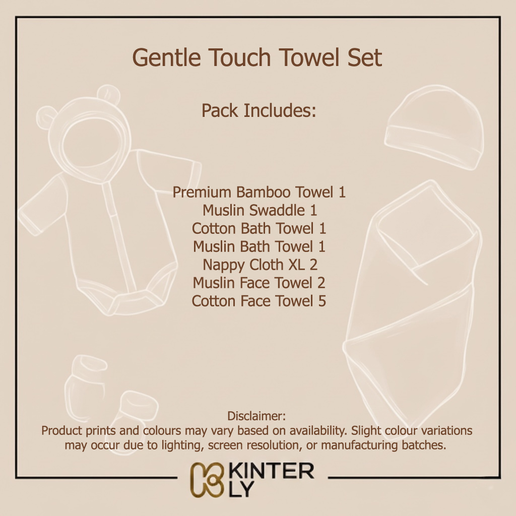 A gentle and complete bath-time essentials set crafted for your baby’s delicate skin. This thoughtfully curated collection includes a premium bamboo towel, soft muslin swaddle, cotton and muslin bath towels, extra-large nappy cloths, and face towels in muslin and cotton. Made from breathable, highly absorbent, and baby-safe fabrics, the Tender Care Towel Set ensures comfort, softness, and everyday convenience for your little one.